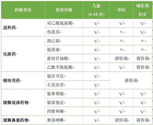 √:可以选用;×:避免使用;请咨询:权衡利弊谨慎使用,咨询医师或药师。